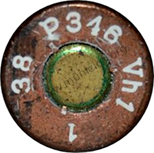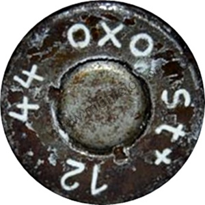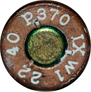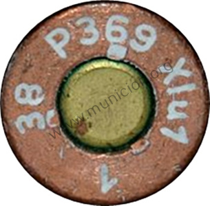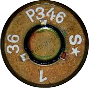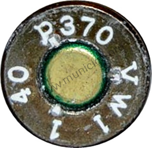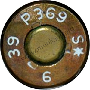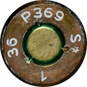 | OBSERVACIONES: | Cartucho ordinario con bala s.S. (anillo verde pistón) y vaina de acero lacado en tono gris.La fábrica P369/oxo fabricó munición de 1936 a 1945, en 1944 paró la producción de 7,9x57 y en 1945 la del 7,9x33. |