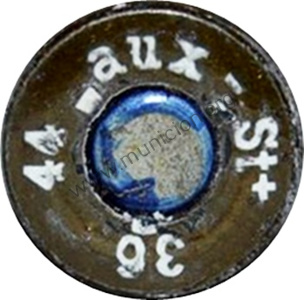 | OBSERVACIONES: | Cartucho semiperforante, bala S.m.E. (Spitzgeschoss mit Eisenkern) bala aguda con núcleo de hierro y envuelta de zink, vaina de acero lacado en tono verde, pistón modelo 30/40 (Zdh.30/40). El segmento entre aux y St+ indica que el pistón tiene un solo oido. Polte/aux comenzó a fabricar vainas de acero en 1935.En 1940 realizaron el cambio de código P a aux. |